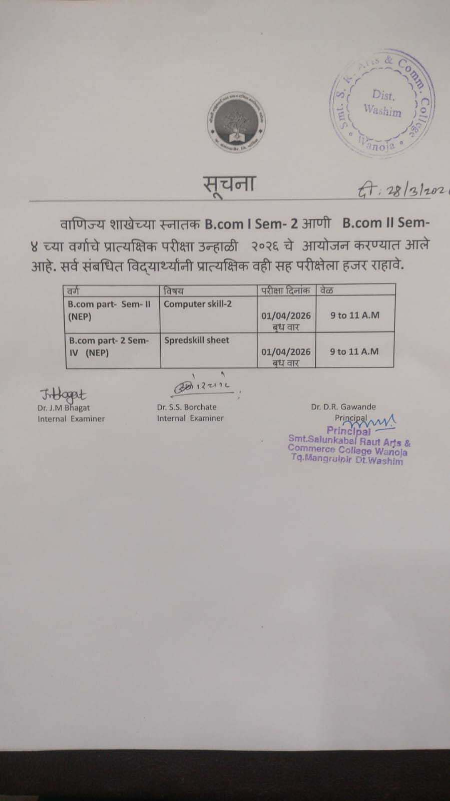 Notice about fill up exam form